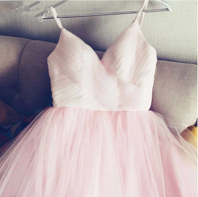Elegant A Line Spaghetti Straps V Neck Tulle Pink Backless Long Prom Dresses, 026