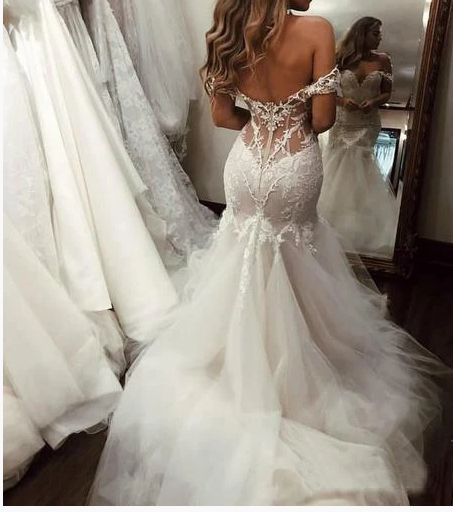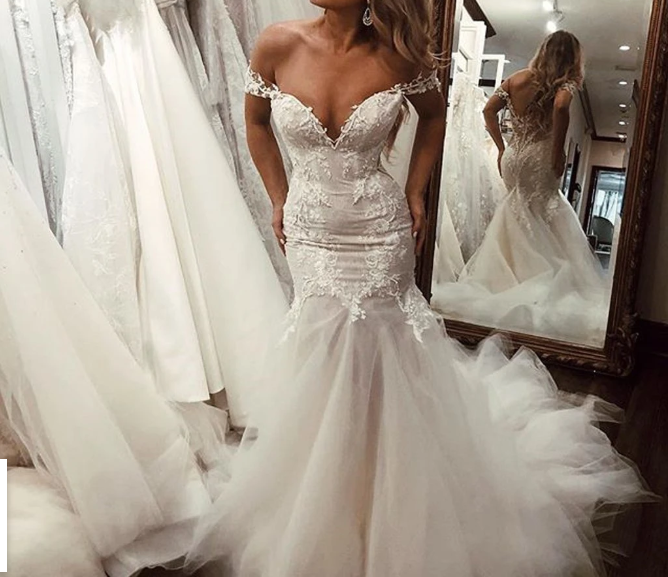 Off the Shoulder Mermaid Tulle Wedding Dresses Lace Appliques Bridal Gown, 167