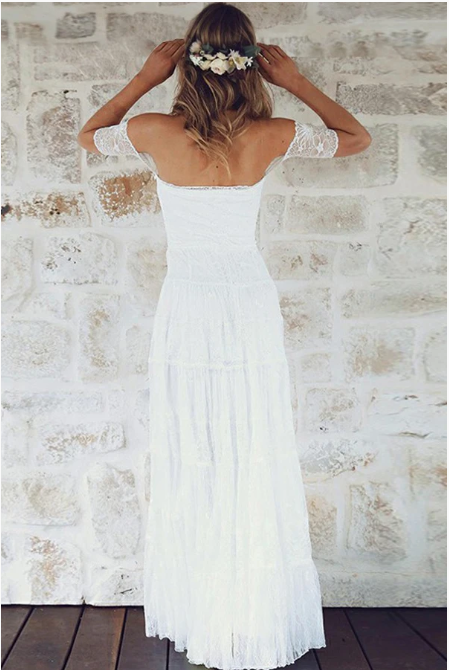 A-Line Off-the-Shoulder Short Sleeves Backless White Lace Boho Wedding Dresses, 175