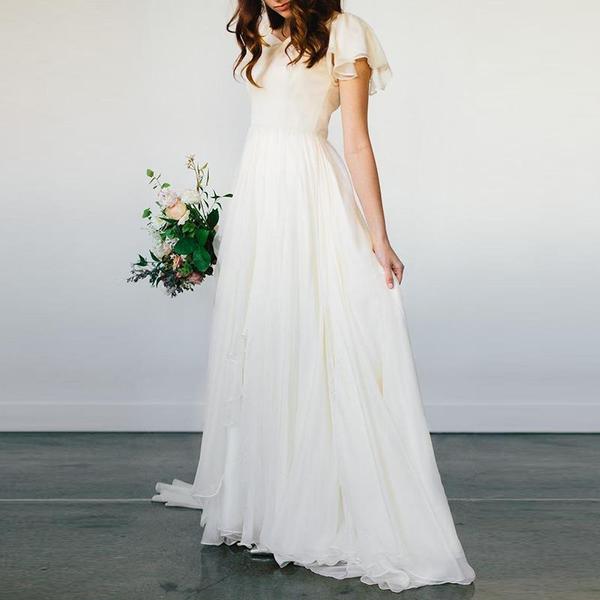 Flowy Chiffon Beach Wedding Dresses 2022 Short Sleeves Temple Bridal Gowns Long Informal Reception Dress Custom Size,557