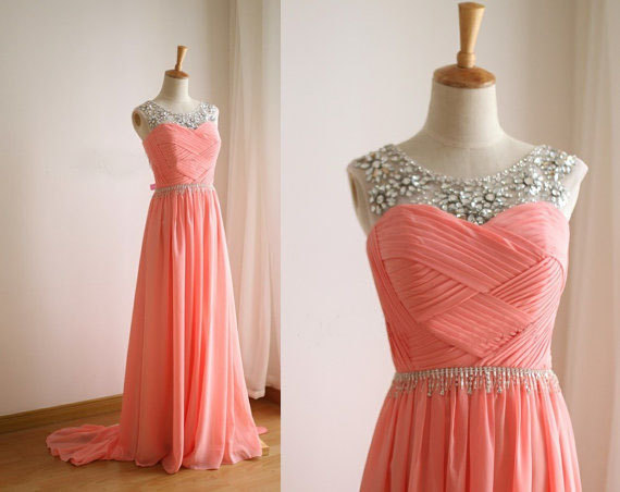 Handmade Coral Chiffon Round Neckline A line Floor Length Prom Dresses with Beadings, Coral Chiffon Prom Dresses, Prom Dresses,Bridesmaid Dress, 097