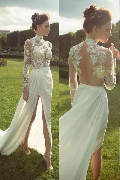 Gorgeous High Neck Long Sleeve See Through Lace Top Side Slit Ivory Chiffon Wedding Dress, 286