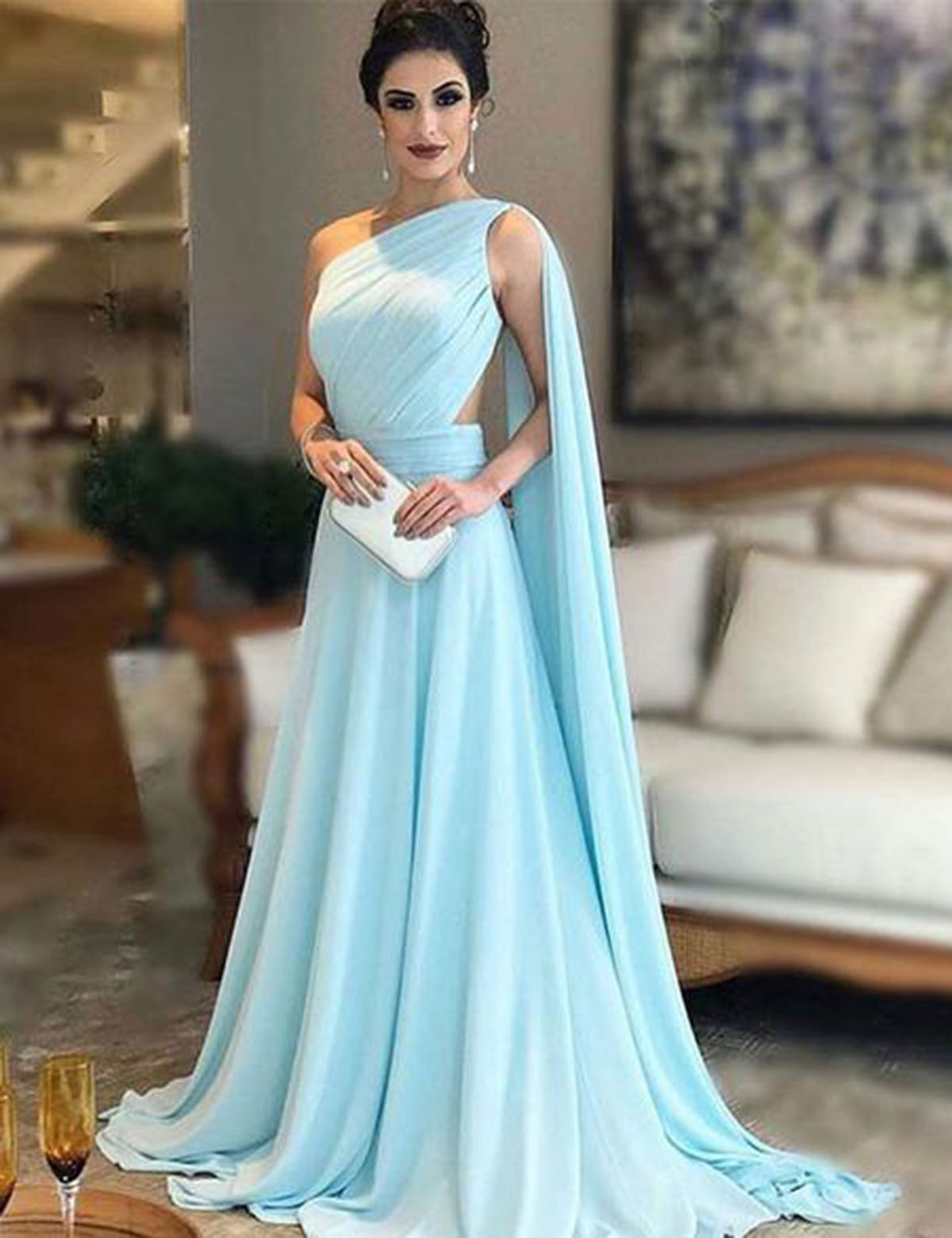Simple Baby Blue Chiffon One Shoulder A Line Long Prom Dress, Occasion Dress, 390