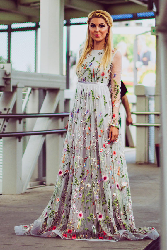 Floral prom dress, Color prom dress with sleeves, Bridal dress Long wedding guest gown, Embroidered prom dress, 532