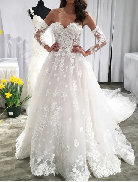 A Line Long Sleeves Ivory Lace Appliques Beads Sweetheart Long Wedding Dresses, 025