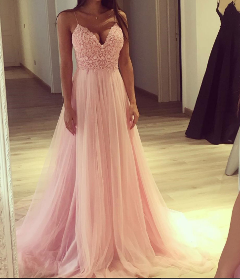 A-line Spaghetti Starp Sweep Train Tulle Appliqued Beaded Sexy Prom Dresses, 045