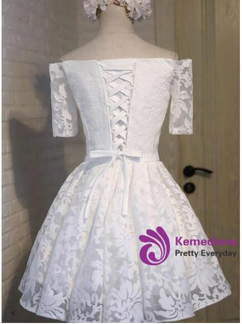 White Lace Homecoming Dress, Short Sleeves Off the Shoulder Homecoming Dresses, Short Prom Dresses, 060
