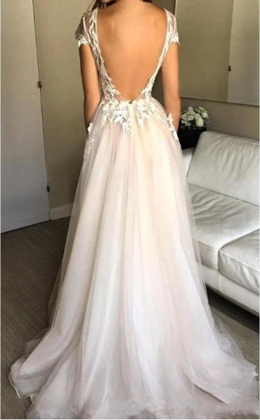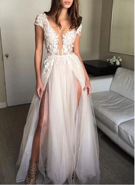 Cap Sleeve Deep V Neck Prom Dress with Appliques Backless Split Wedding Dresses, 109