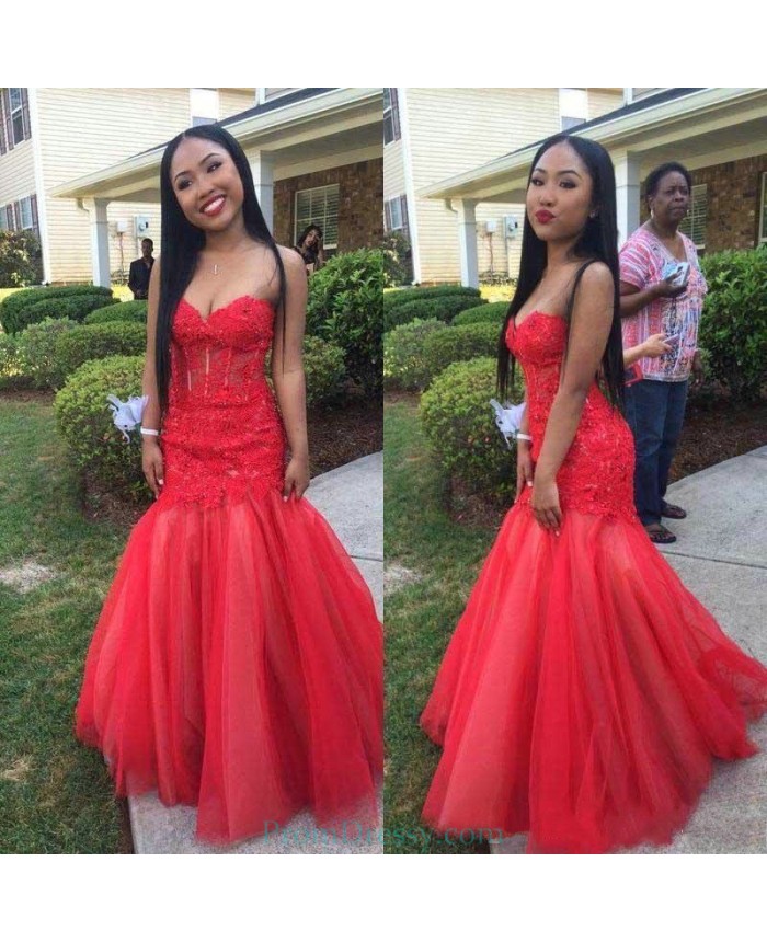 Red Off the Shoulder Sweetheart Prom Dress, Appliques Tulle Mermaid Prom Dresses, Evening Dress, Long Party Dress, 112