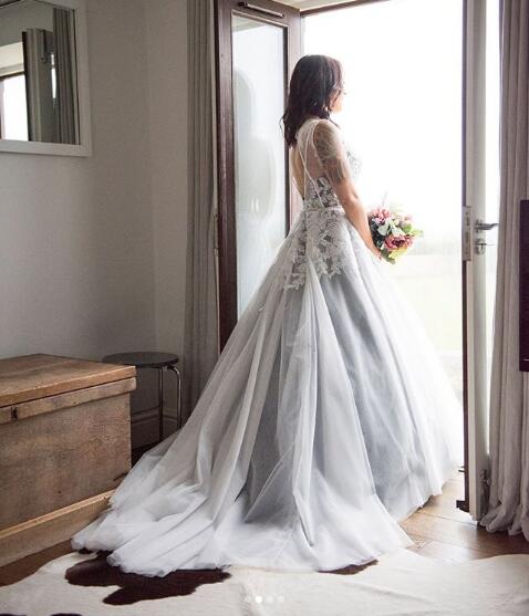 Ball Gown Navy Blue and White Wedding Dresses Sheer Long Sleeve Appliques Bridal Gowns, 237