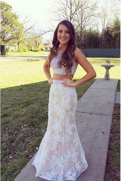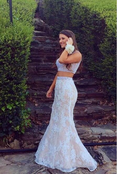 White lace two pieces mermaid beading long prom dress, graduation dress, 245