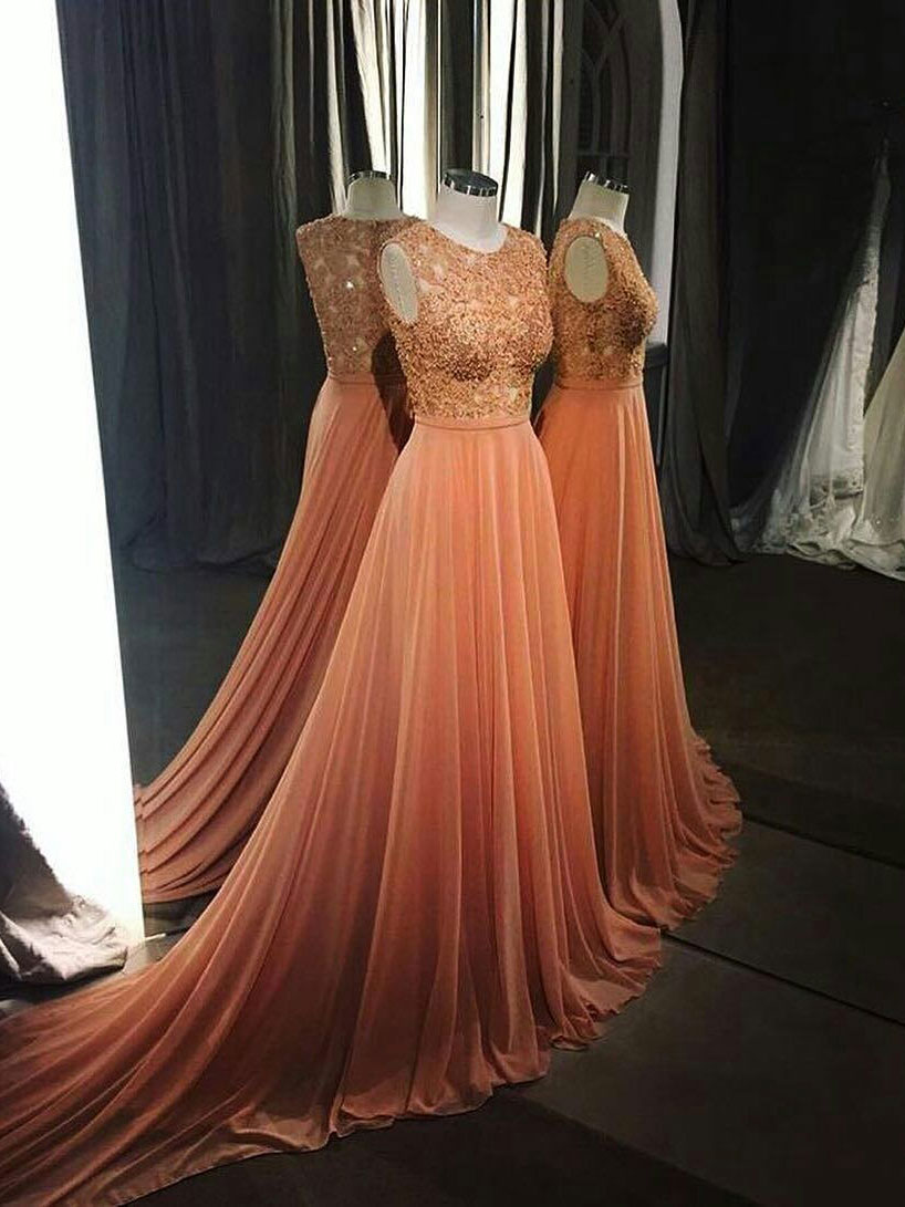 A-line Scoop-Neck Chapel Train Chiffon Appliqued Elegant Prom Dresses, 253