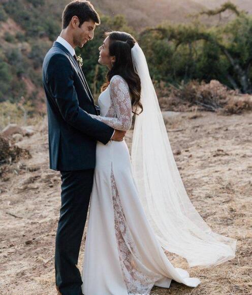 Mermaid Cheap Wedding Dresses Sweep Train Chiffon Long Sleeve Lace Wedding Dress Bridal Gowns With Jewel Neckline, 279