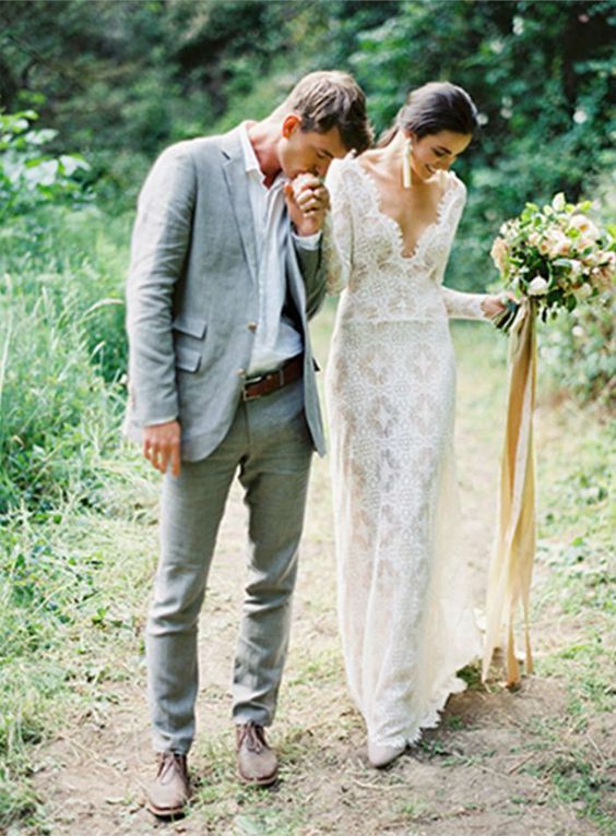Mermaid Boho Wedding Dress, V-neck Chiffon Wedding Dress, Long Lace Wedding Dress Bridal Dress, 280
