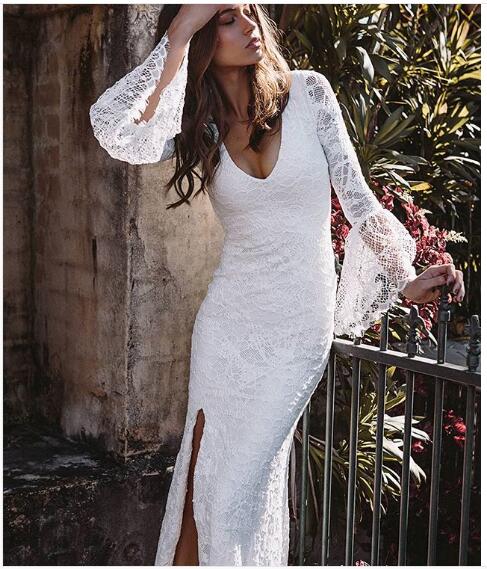 Boho Wedding Dress,V-neck Lace Wedding Dress, Long Wedding Dresses Bridal Dress, 282
