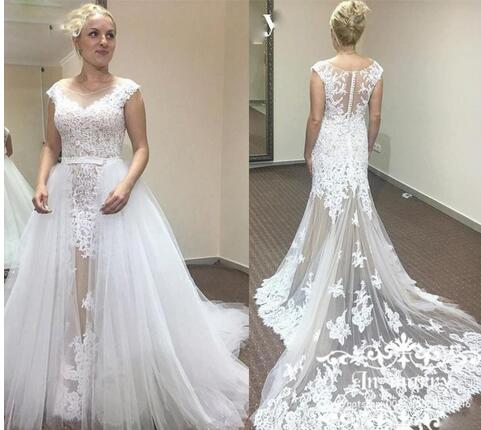 Detachable Skirt Mermaid Wedding Dresses Sheer Scoop Neck Illusion Back Wedding Gowns with Lace Appliques Overskirts Bridal Dresses, 322