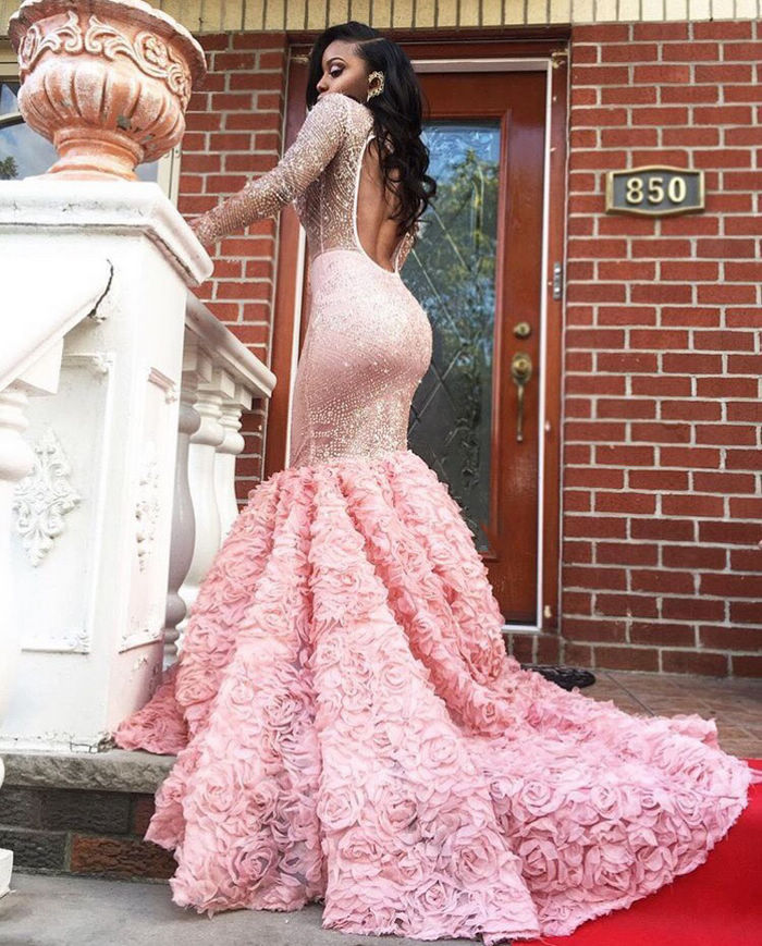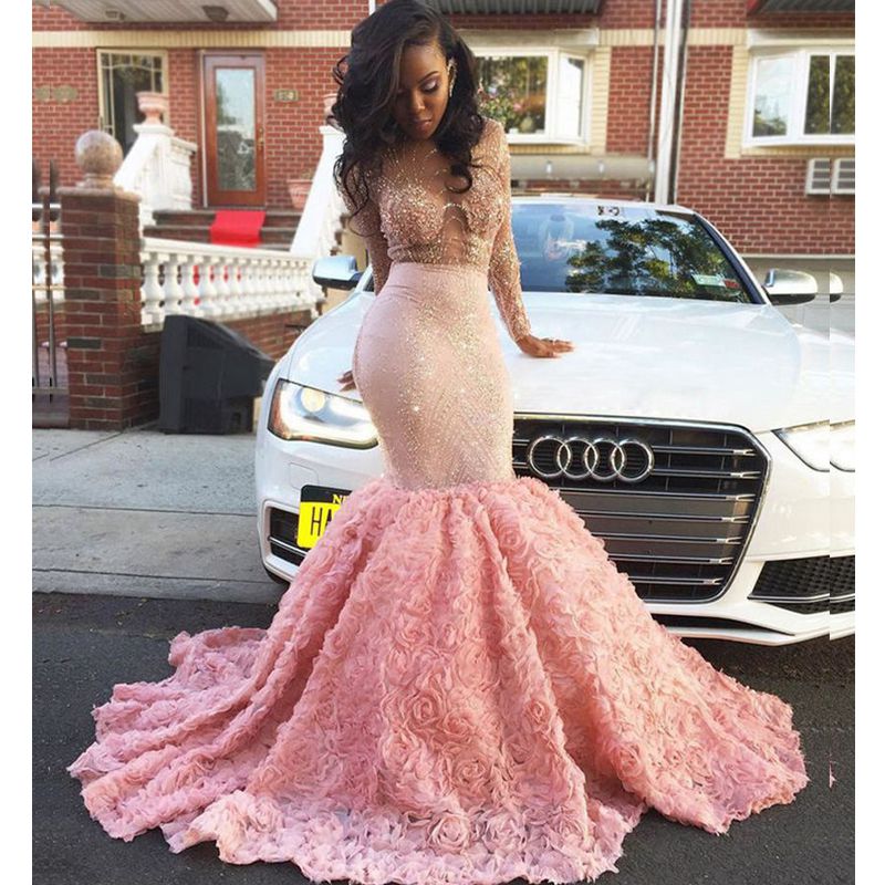 Glamorous Beading Sheer neckline Prom Dresses, Long Sleeves Lace Mermaid Prom Dresses, African Girl Prom Dress for Black Girls, 333
