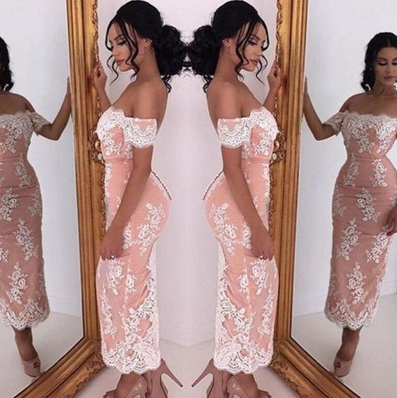 Pink Sheath Prom Dress Off Shoulder Bateau Neckline Lace Tea Length Sexy Women Party Gowns Formal Evening Dresses, 364