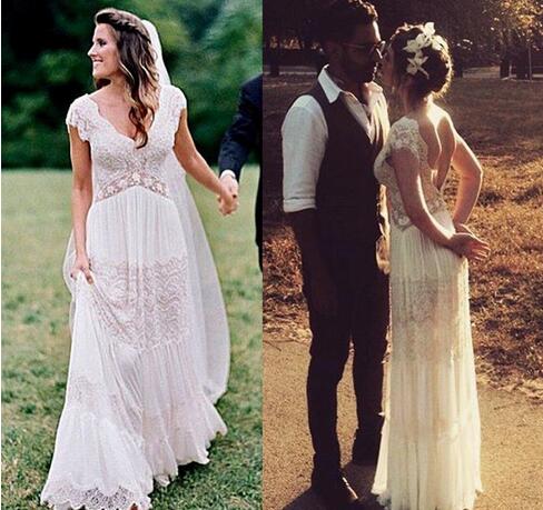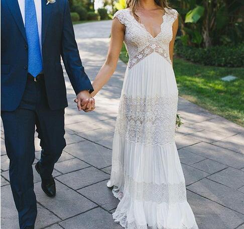 Vintage lihi hod Wedding Dresses Sheer Deep V Neck Backless Bohemia Lace Applique 2018 Wedding Gowns Chiffon Court Train Long Bridal Dress, 423