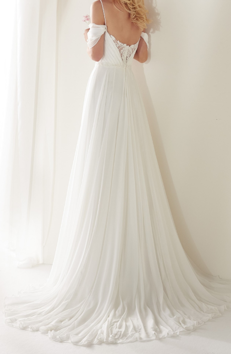 White Chiffon Lace Appliques Wedding Dress Off Shoulder Spaghetti Straps Sheath Bridal Dress Long Prom Dress,529